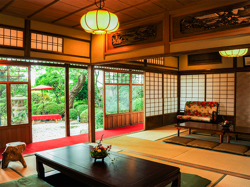 美しい庭園を備え、縁側に面した和室はふた間続きという日本の伝統的な構成が採用されてます。現在は婚礼会場として活用されています。